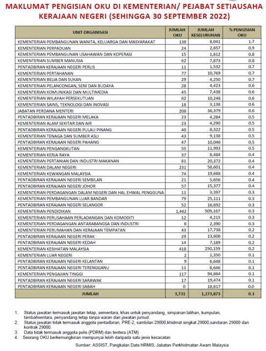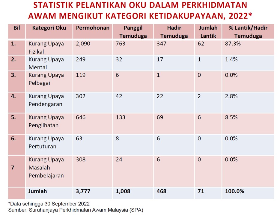 Suruhanjaya Perkhidmatan Awam (SPA) data show that, for the year 2022 (data as of September 2022), of 3,777 civil service job applications by persons with disabilities, only 1,008 (27%) were called for an interview (see image 2). This clearly shows the high level of rejection of persons with disabilities at the application phase, even before they have a chance to be interviewed. We need to ask: What were the reasons for all these rejections? Were they not qualified for the job? Was there discrimination? What was done to support all those rejected in getting employment? Presumably, only those who met the academic criteria applied.