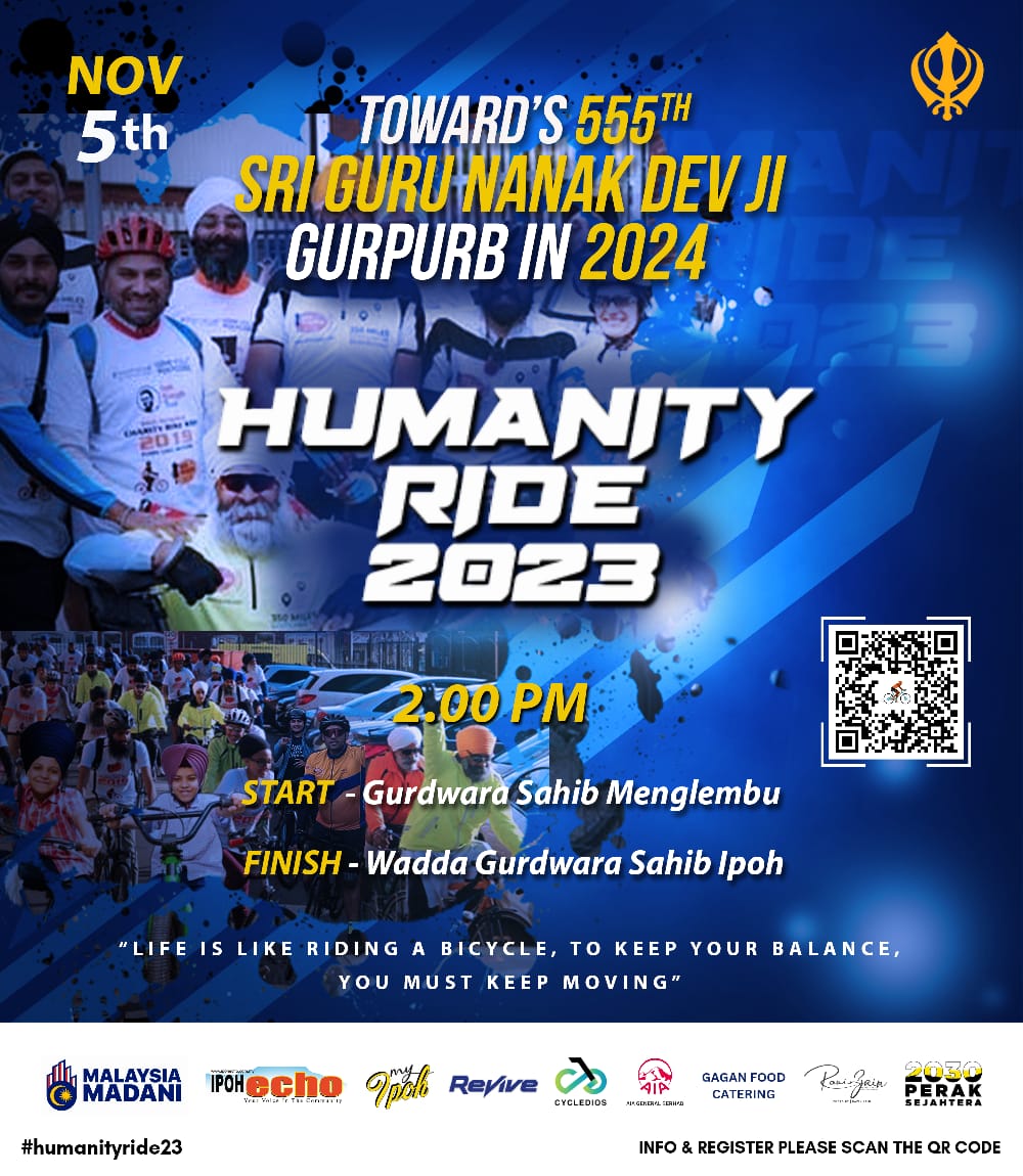 Humanity Ride 2023 will take place on November 5 (Sunday) with registration starting at 2 pm and the flag off planned for 4.15 pm. There will be some light refreshments around 3.20 pm, followed by a safety briefing before the flag off. The ride will start from the Gurdwara Sahib Menglembu, Ipoh and finish at the Wadda Gurdwara Sahib Ipoh.