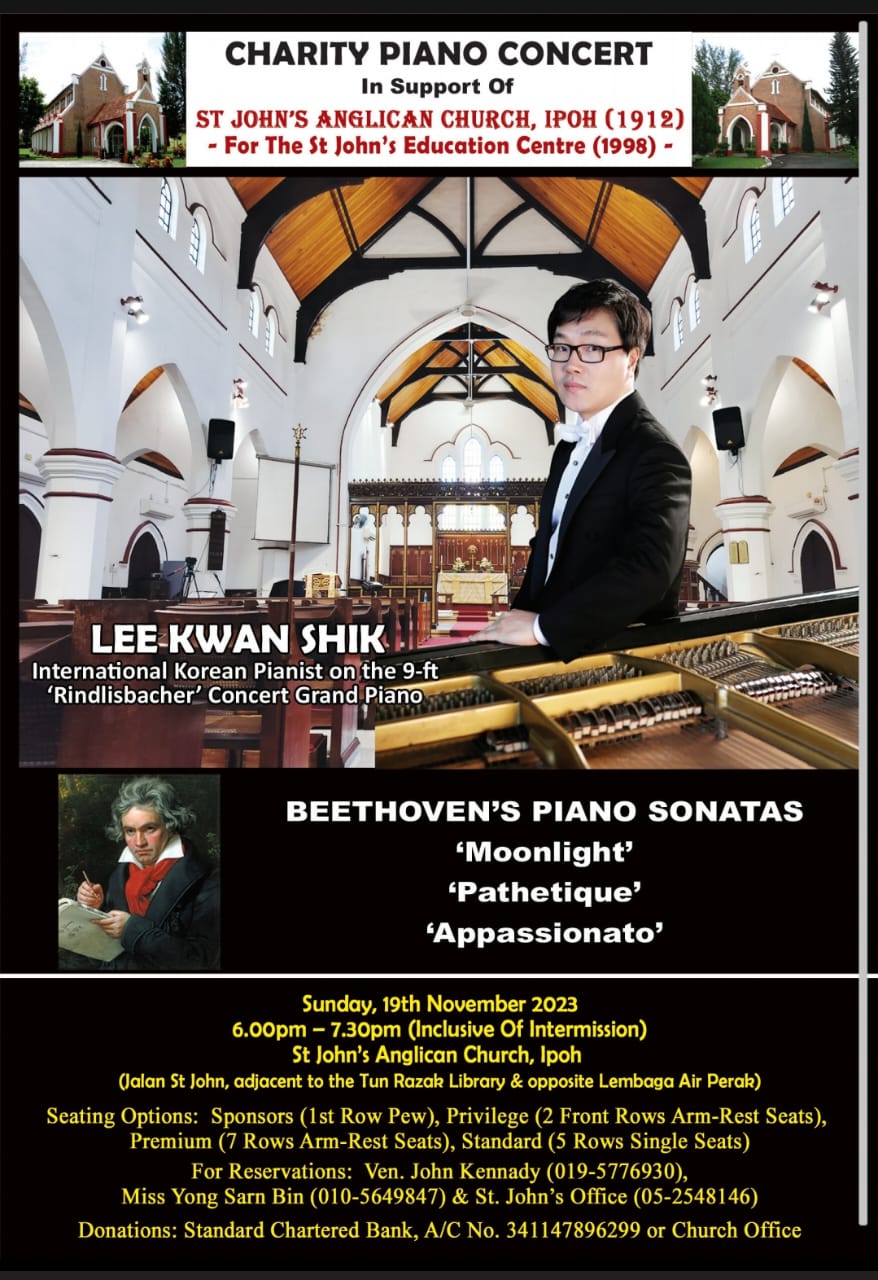 A charity piano concert in support of St. John’s Anglican Church, Ipoh for the St. John’s Education Centre will be held on November 19 at St. John’s Anglican Church, Ipoh.