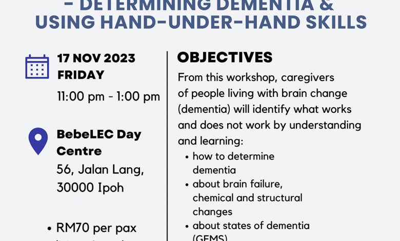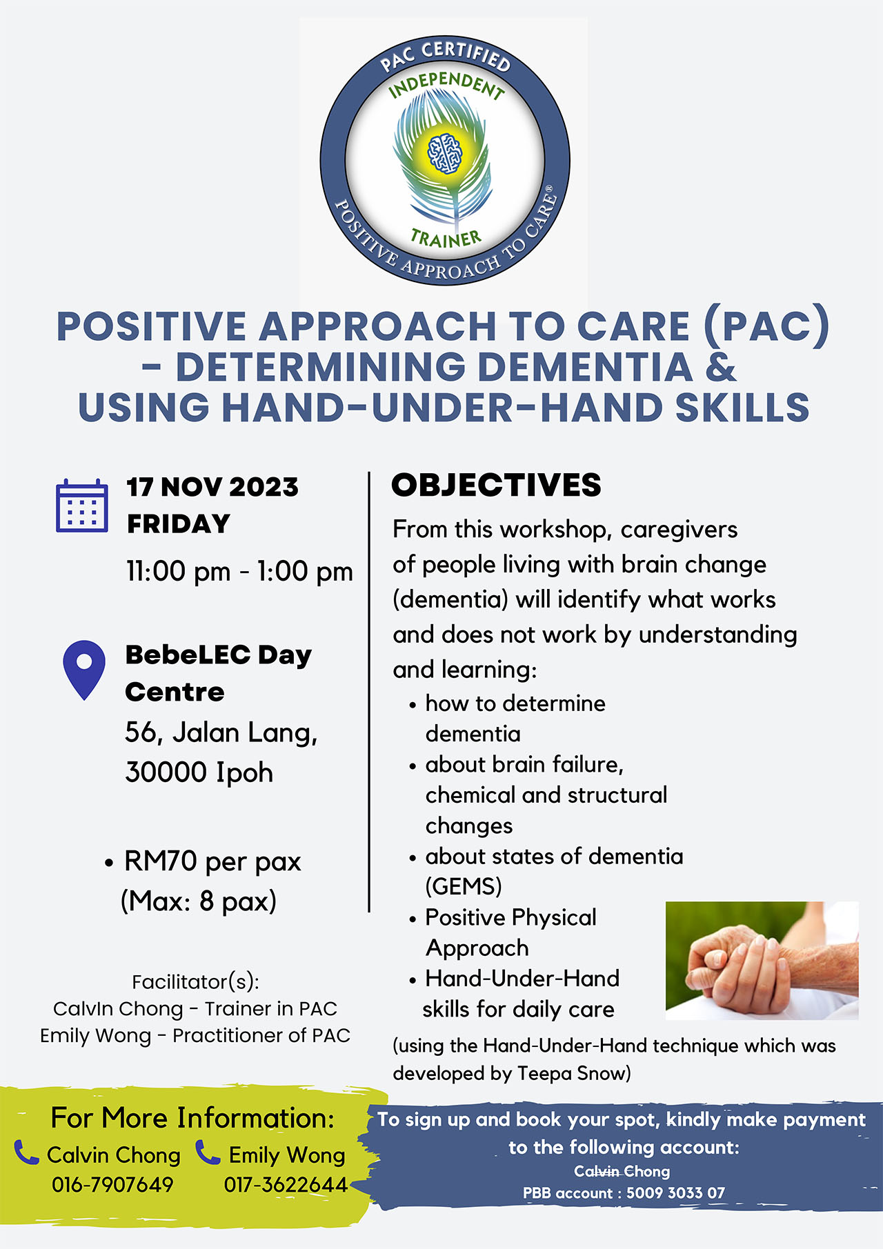 So for those dealing with this difficult situation, mark your calendars for this Nov 17 (Friday), as there will be a Positive Approach to Care (PAC) certified workshop at BebeLEC Day Centre on 56, Jalan Lang, 30000 Ipoh, from 11 pm to 1 pm, which will focus on the topic of Determining Dementia & Using Hand-Under-Hand skills.