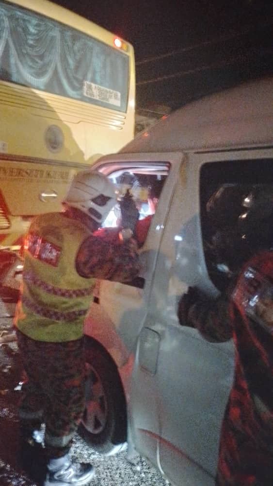 BERUAS: A man was injured and trapped after the van he was in collided with the rear of an IPT (Institute of higher Learning)bus in front of the Pantai Remis Mosque here late last night.