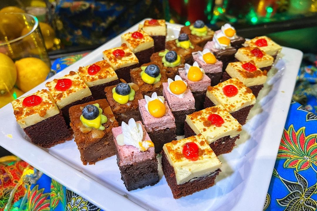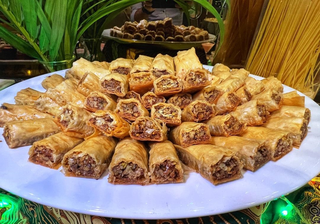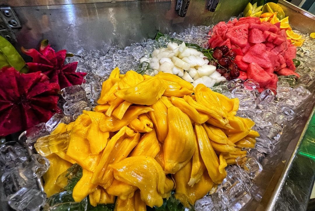 Fresh fruits like honey jackfruit and dragon fruit serve as palate cleansers alongside the delight of assorted traditional cakes and pastries.
