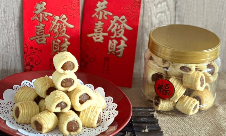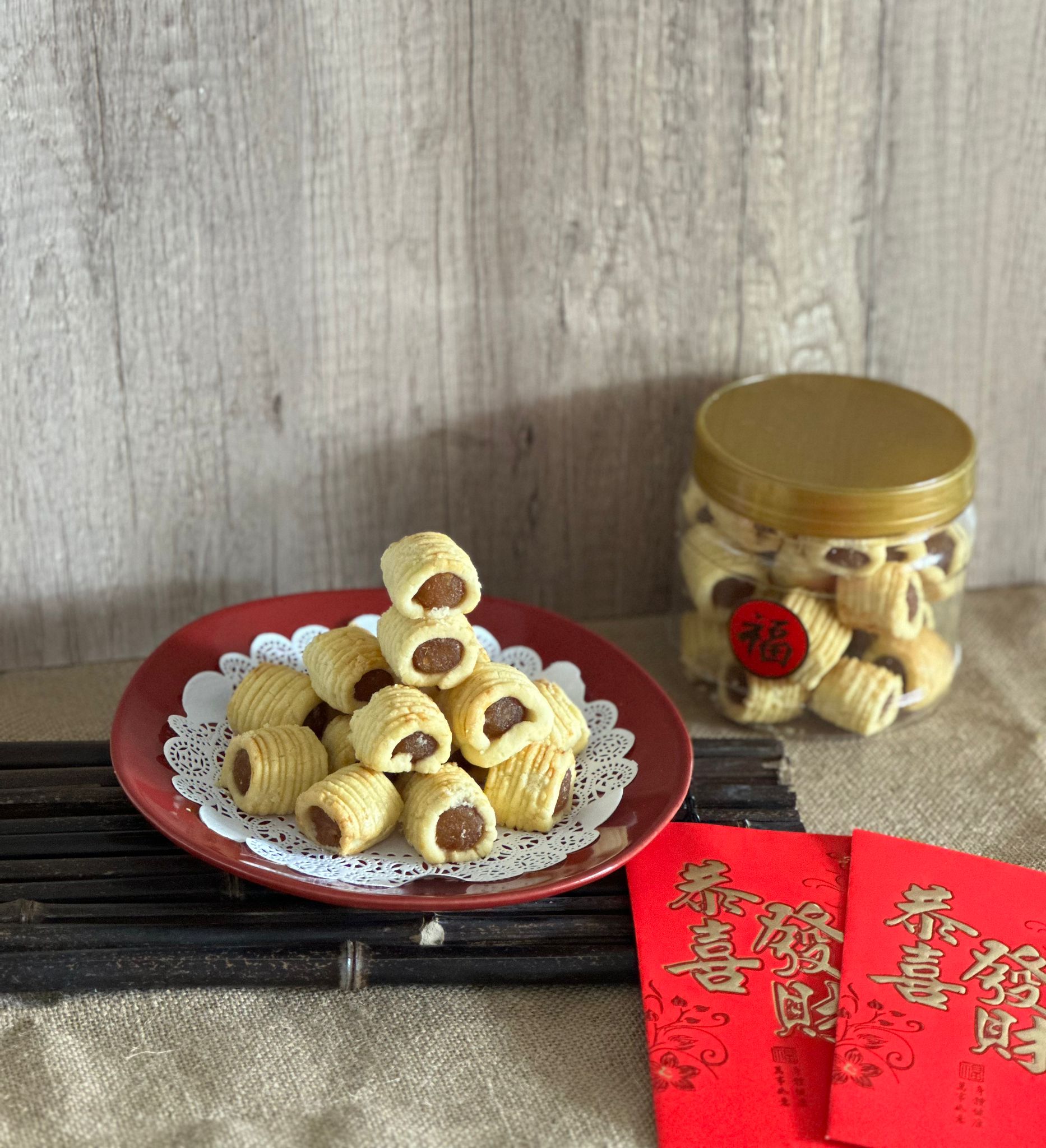 - Use a nastar mould to press the dough into long strips. Wrap the dough strip around each 10g pineapple jam roll, ensuring the ruffled side faces outward. Cut any excess dough as needed.