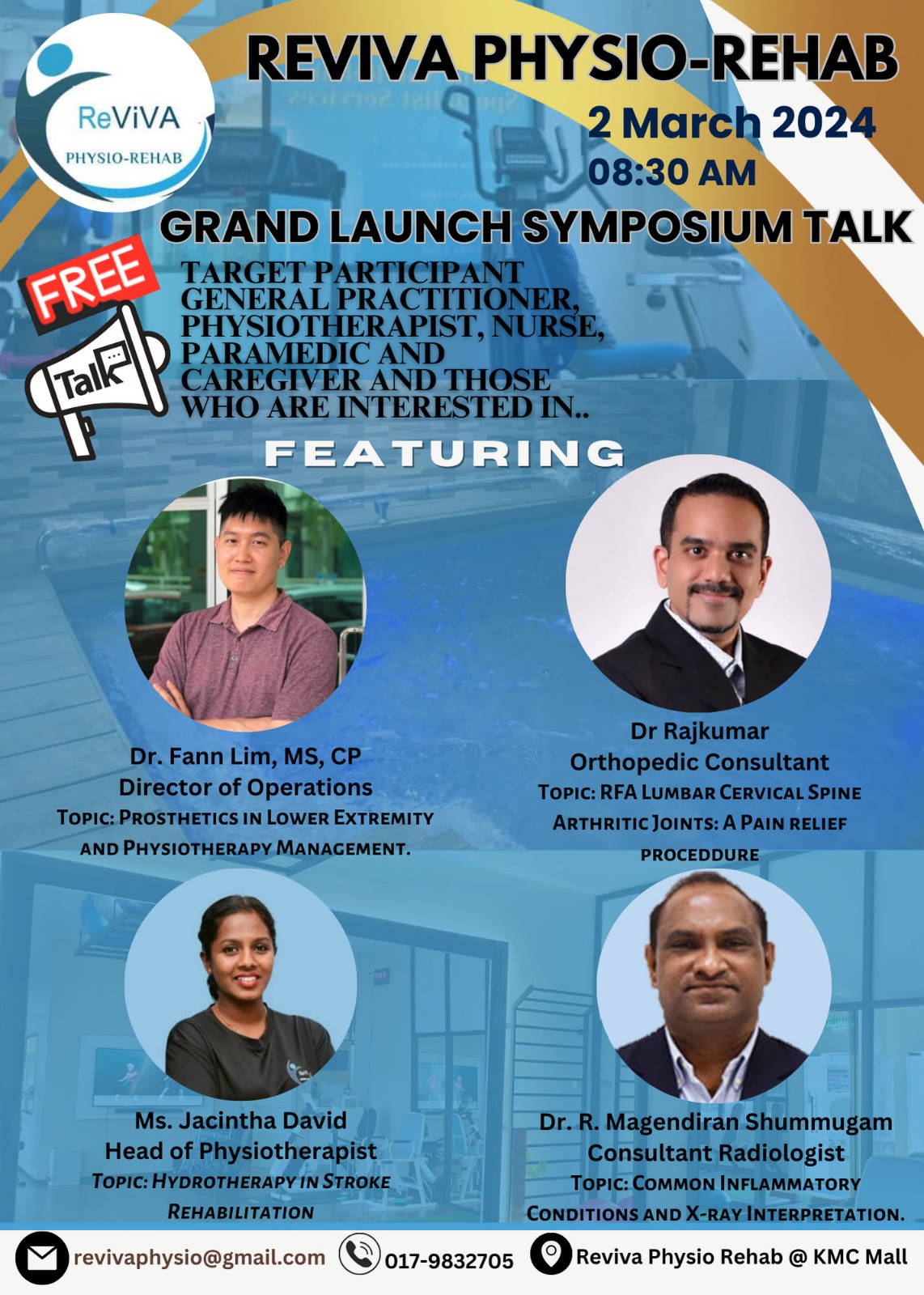 The symposium will feature talks by Dr. Fann Lim, MS, CP Director of Operations on the topic of Prosthetics in Lower Extremity and Physiotherapy Management; Dr. Rajkumar, Orhopedic Consultant on the topic of RFA Lumbar Cervical Spine Arthritic Joints: A Pain Relief Procedure; Ms. Jacintha David, the Head of Physiotherapist on the topic of Hydrotherapy in Stroke Rehabilitation and finally Dr. R. Magendiran Shummugam, Consultant Radiologist on the topic of Common Inflammatory Conditions and X-Ray Interpretation.