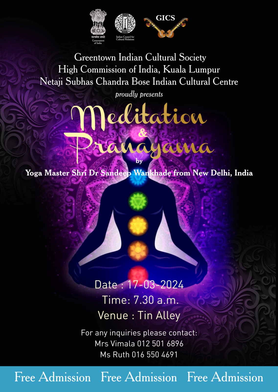 The Greentown Indian Cultural Society; High Commission of India, Kuala Lumpur; Netaji Subhas Chandra Bose Indian Cultural Centre will be presenting a free session on meditation and the breathing techniques of pranayama tomorrow, March 17, from 7.30 am onwards at Tin Alley.