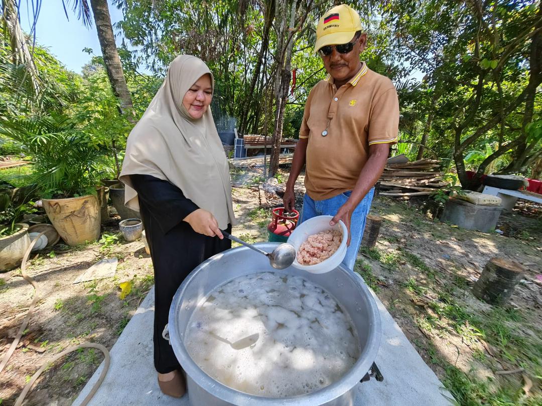 Sharing the recipe for bubur lambuk, she said that among the main ingredients needed are rice, meat, or chicken (meat choice tastes sweeter).
