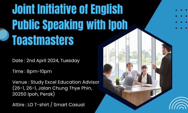 In a joint initiative to foster public speaking in English, the Ipoh Toastmasters and Junior Chamber International (JCI) Kinta, will be hosting a workshop on 2 April, from 8 pm to 10 pm at Study Excel Education Advisor, on Chung Thye Phin road.
