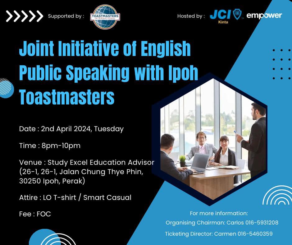 This is a great opportunity to dip your toe and even improve yourself in the practice of public speaking in the English language. It will also be an opportunity to make any inquiries to the Ipoh Toastmasters or JCI Kinta.
