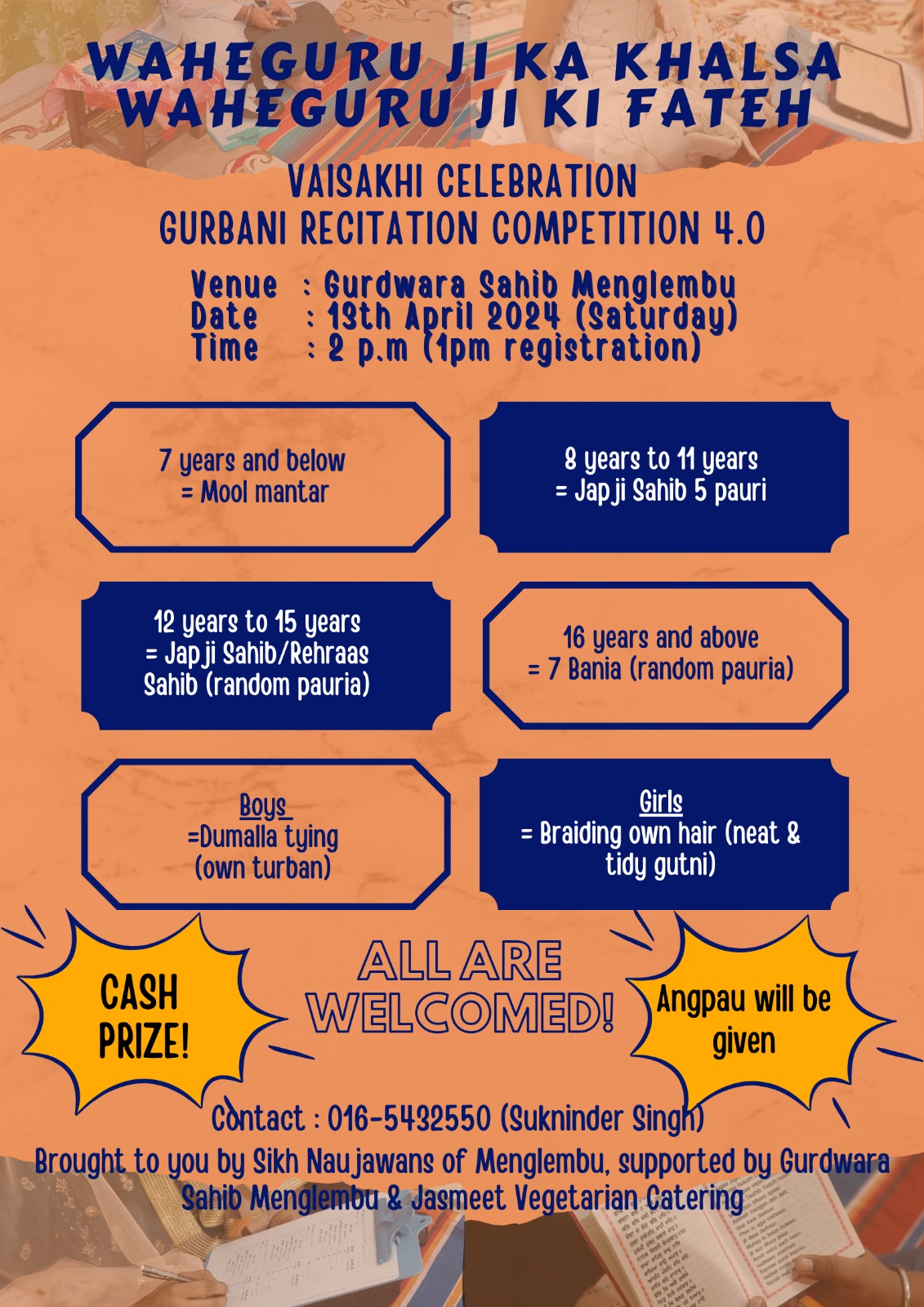 In conjunction with the Vesakhi Celebration, there will be a Gurbani Recitation Competition at Gurdwara Sahib Menglembu, Ipoh.