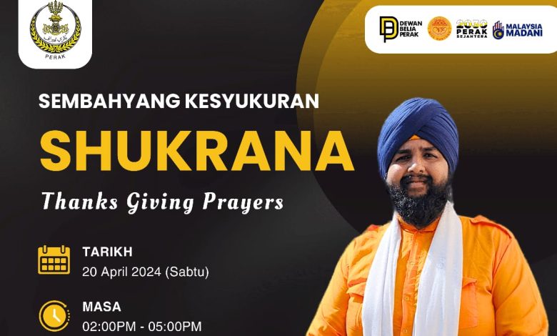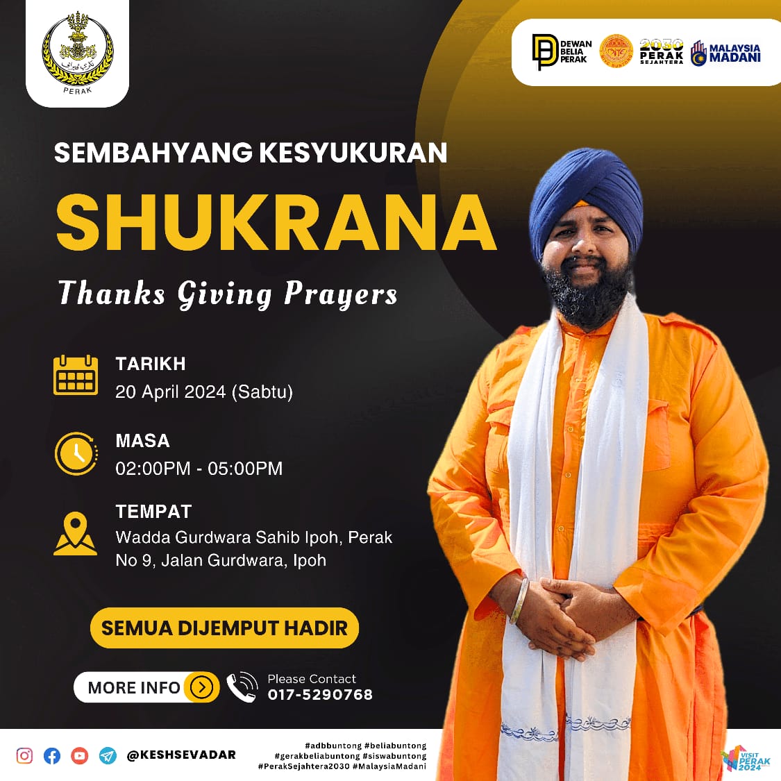 There will be a thanksgiving prayers session at the Wadda Gurdwara Sahib Ipoh this coming Saturday, on 20 April. It will run from 2 pm to 5 pm.