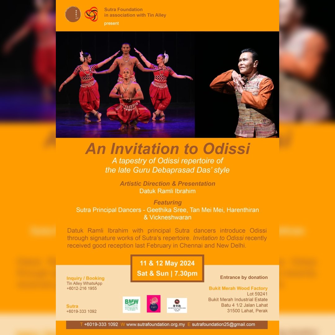 Sutra Foundation, in association with Tin Alley, cordially invites you to Odissi, featuring Sutra principal dancers Geethika Sree, Tan Mei Mei, Harenthiran and Vickneshwaran, with artistic direction and presentation by Datuk Ramli Ibrahim.