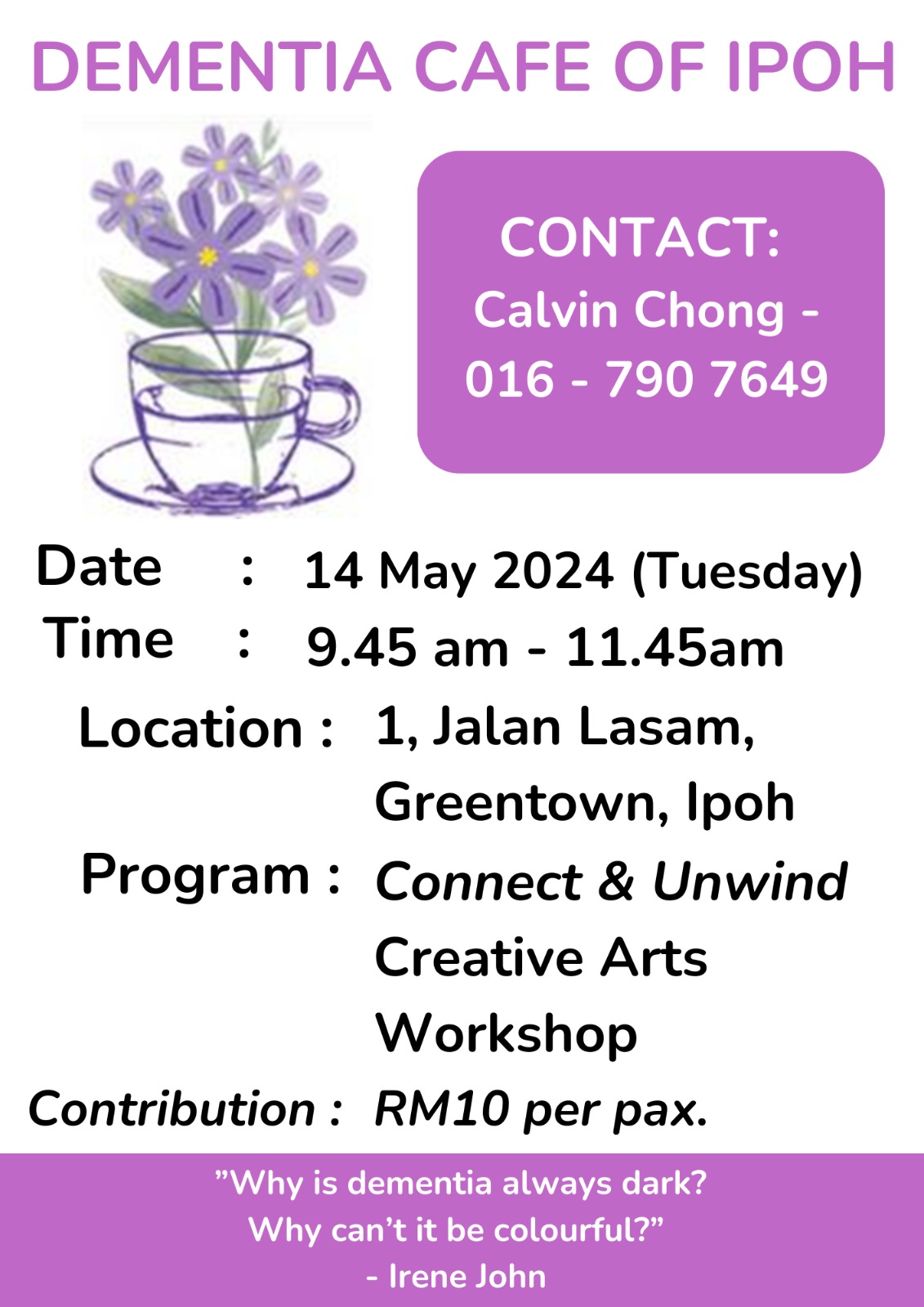 Dementia Cafe of Ipoh will be holding their monthly gathering this coming Tuesday, on May 14 at 1, Jalan Lasam, Greentown, Ipoh from 9.45 am to 11.45 am.