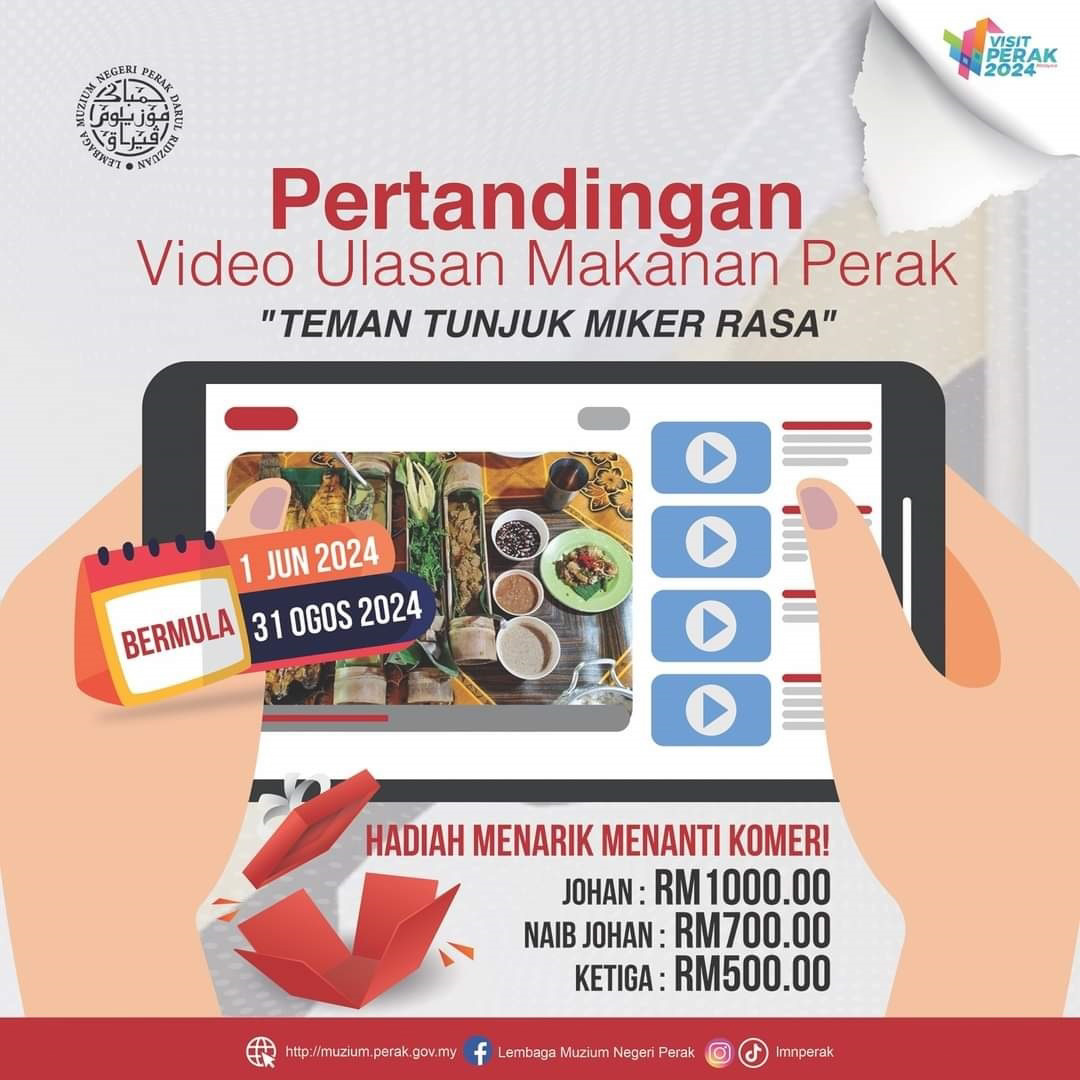 In conjunction with Visit Perak Year, the Perak State Museum Board is organizing the Perak Food Review Video Contest ‘Teman Tunjuk Miker Rasa’ (I Present, You Taste).