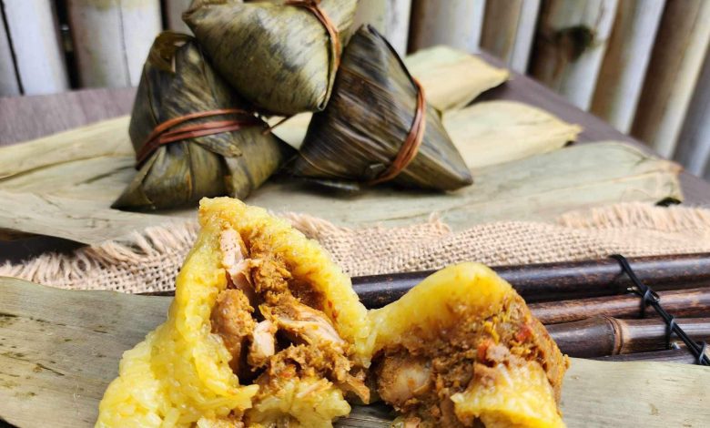 - Place two bamboo leaves on top of each other with the smooth side up and fold the top end diagonally into a cup shape to form a cone.