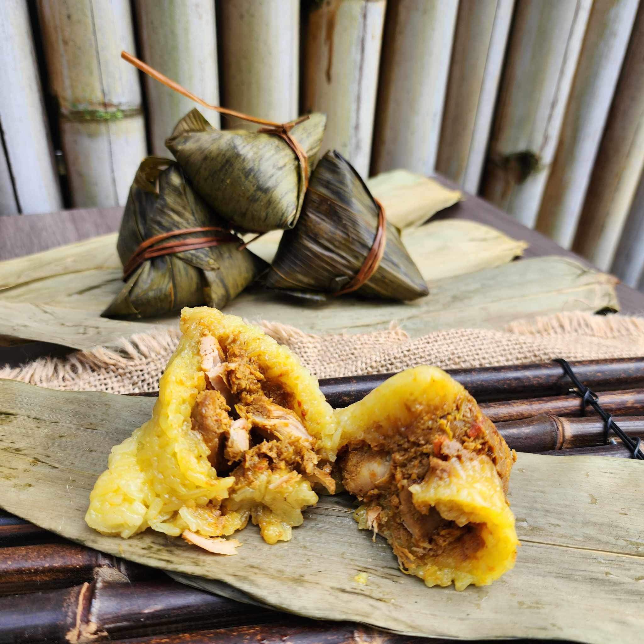 - Fold the top of the leaves over the rice and secure with kitchen string. Repeat with the remaining dumplings.