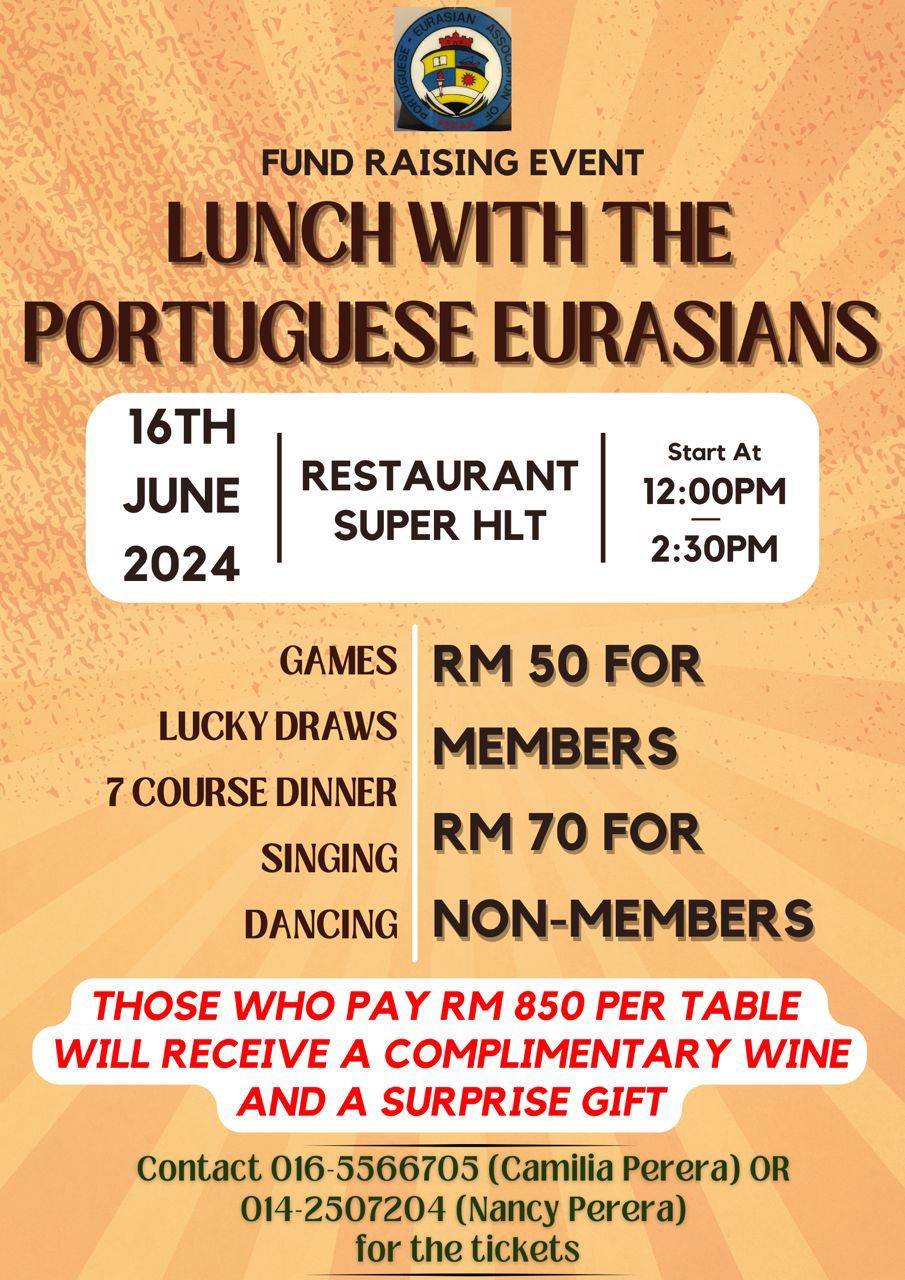 The Association of Portuguese Eurasians will be holding a fundraising event at the Restaurant Super HLT on June 16 (Sunday) from 12 pm to 2.30 pm, to cover their association expenses.