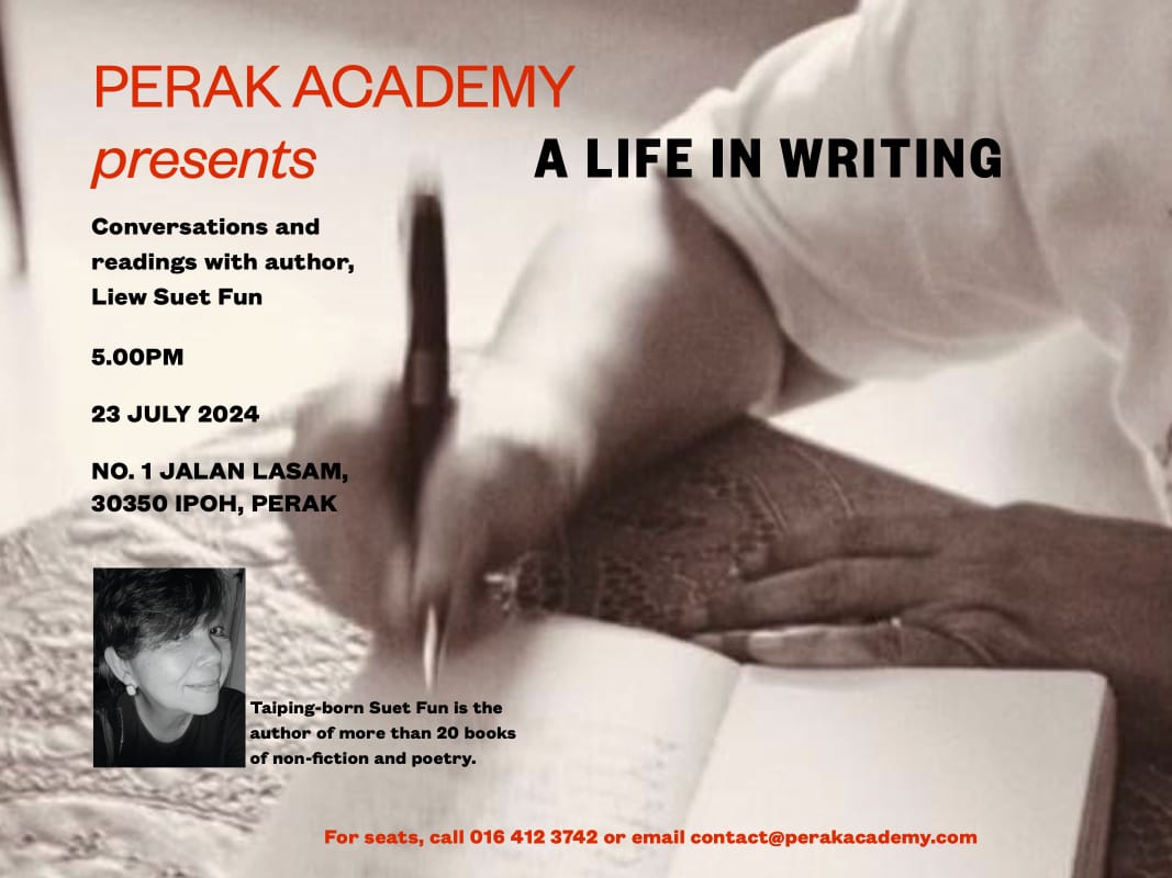 Perak Academy proudly presents, “A Life in Writing”. A conversation and a reading with author Liew Suet Fun, which will be held at No. 1 Jalan Lasam, 30350, Ipoh, Perak, on 23 July 2024 at 5 pm.