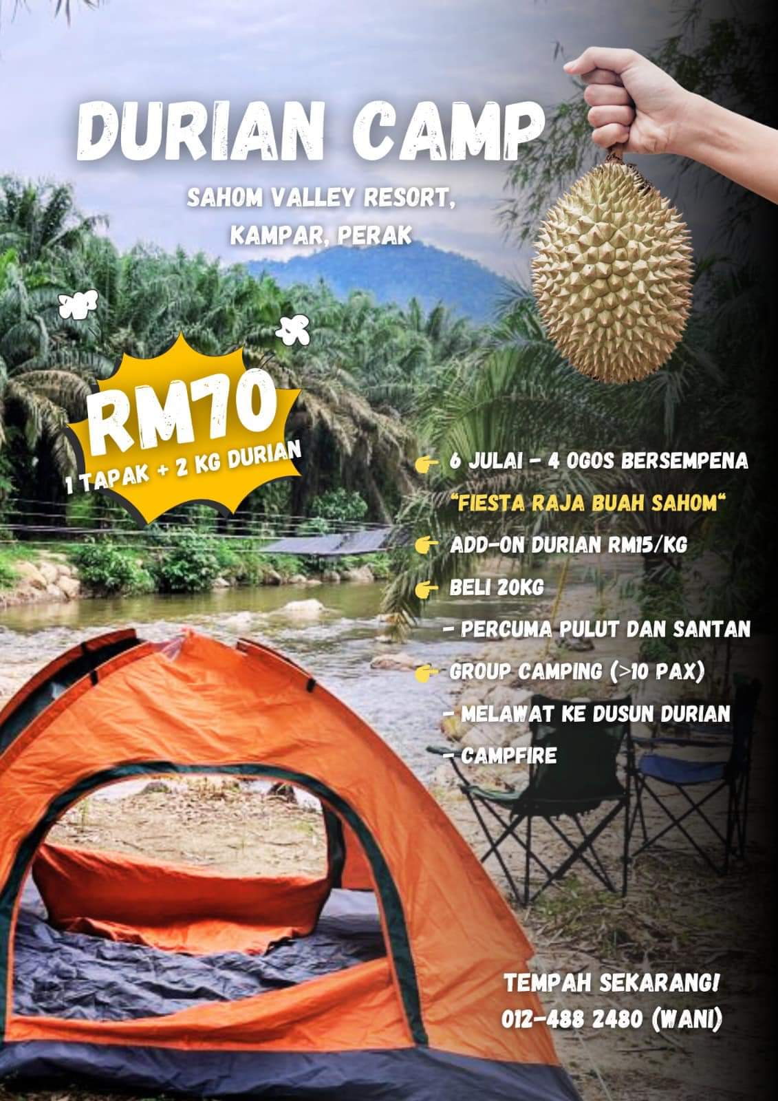 GOPENG: For just RM70, visitors have the opportunity to enjoy a spa treat while enjoying durian with ‘camping vibes’ at Sahom Valley Resort from July 6th to August 4th.