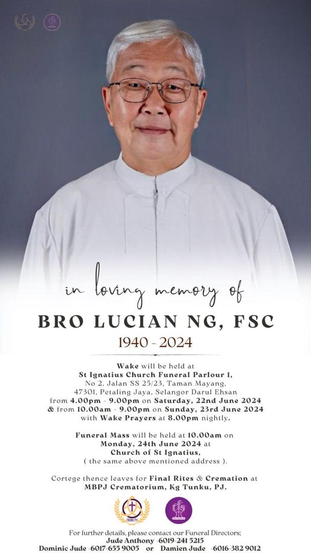 In loving memory of Brother Lucian Ng, his wake will be held at St. Ignatius Church Funeral Parlour 1, at No 2, Jalan SS 25/23, Taman Mayang, 47301, Petaling Jaya, Selangor Darul Ehsan from 4 pm to 9 pm on Saturday, 22nd June 2024 and from 10 am to 9 pm on Sunday, 23rd June 2024, with Wake Prayers at 8 pm nightly.