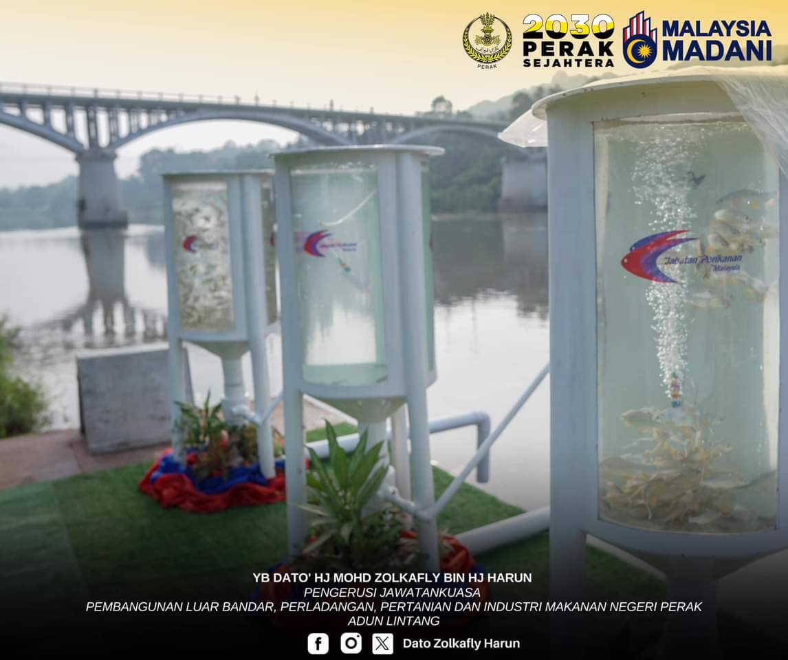 Datuk Mohd Zolkafly Harun, Chairman of the Rural Development, Agriculture, Fisheries, and Food Industry Committee of Perak, stated that three species of fish fries were released in addition to the giant prawn fries.