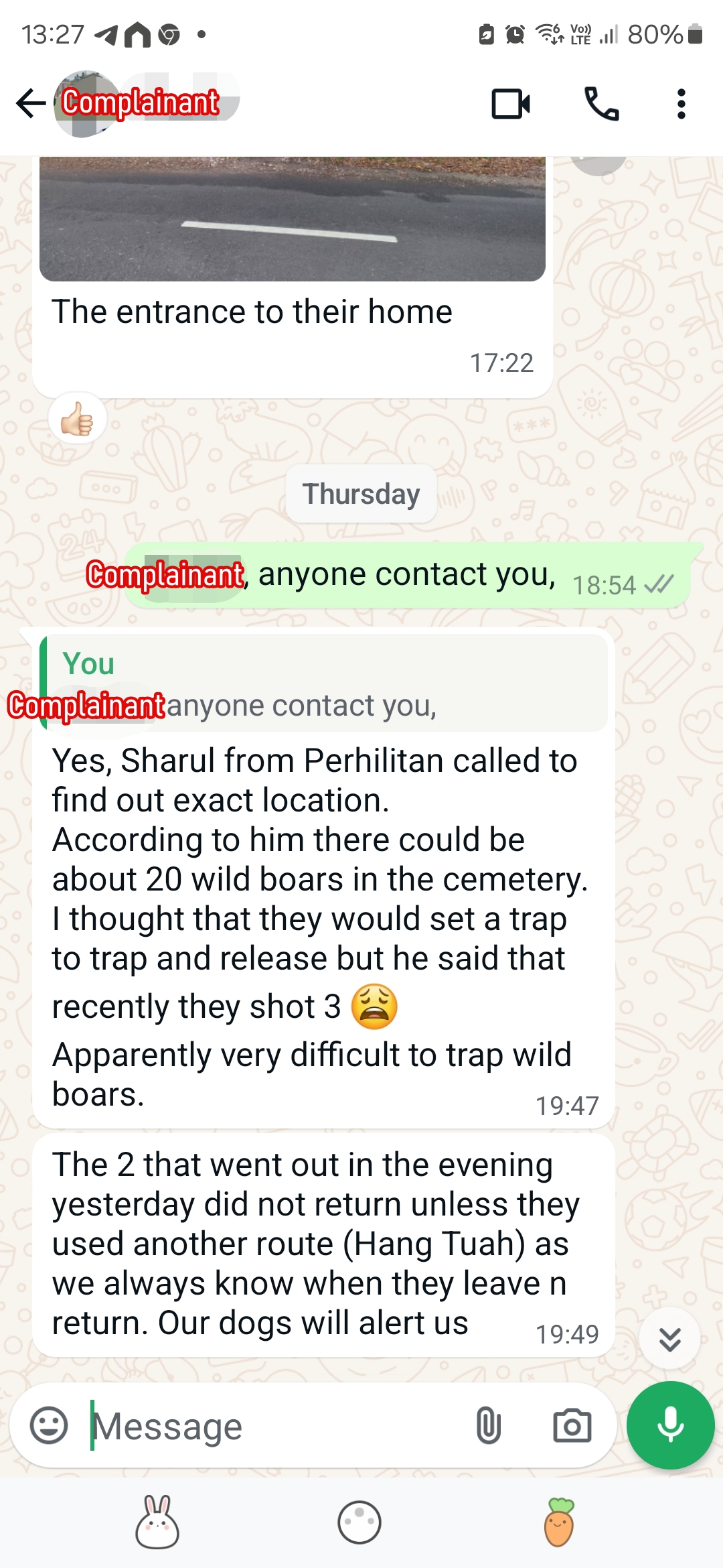 We have contacted the complainer, Shalini, and followed up on the issues all the while. We have informed Perhilitan to address the wild boar problem and also contacted the Association regarding the underbrush on their land.