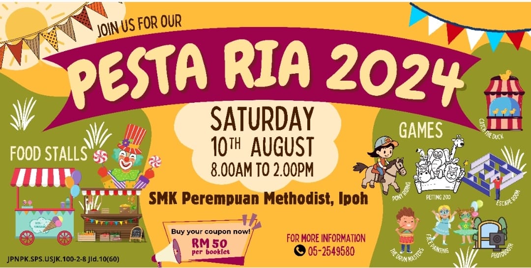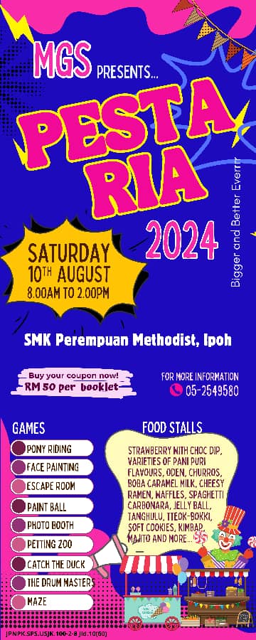SMK Perempuan Methodist (MGS) will be holding a Pesta Ria (Fun Fair) on August 10 at the MGS school compound, which will run from 8 am to 2 pm.