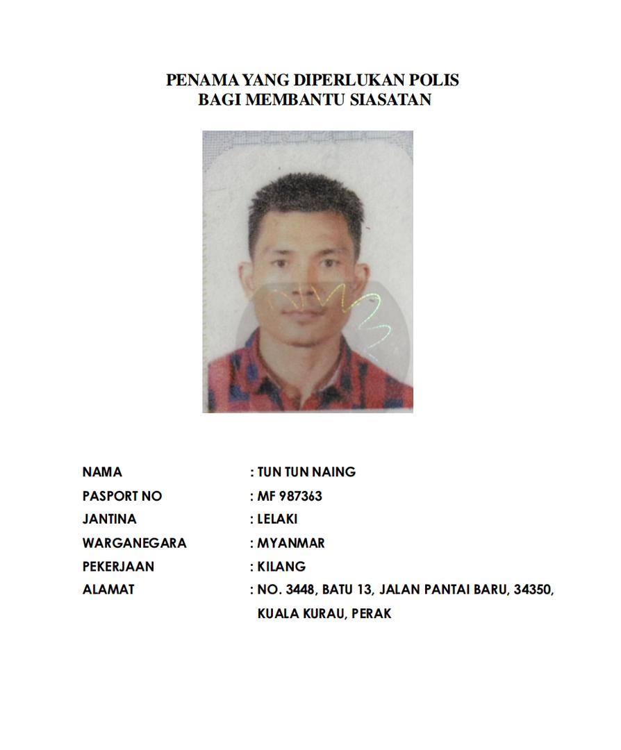 He added that the person sought by the police, Tun Tun Naing, is a factory worker residing at No 3448, Batu 13, Jalan Pantai Baru, Kuala Kurau.