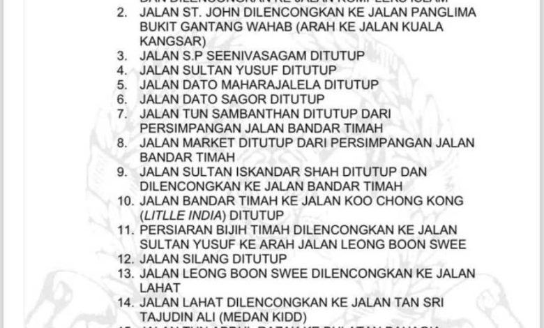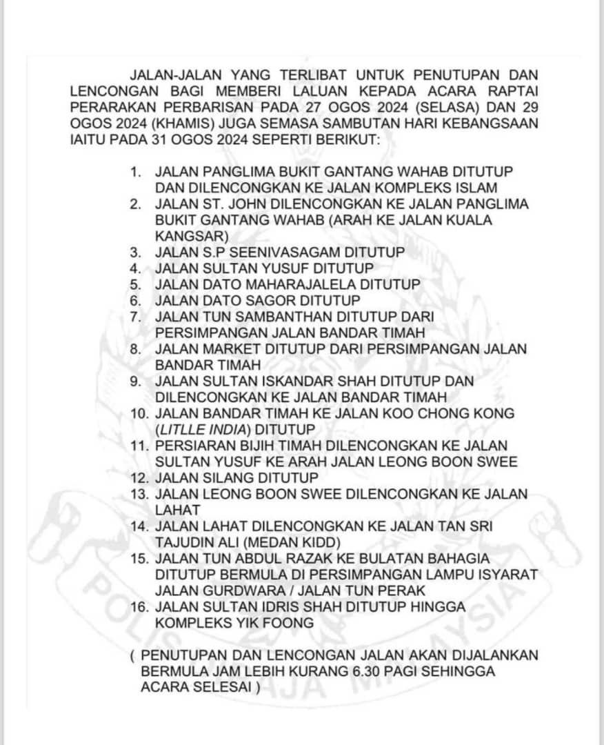 Ipoh District Police Chief, Assistant Commissioner Abang Zainal Abidin Abang Ahmad, stated that the road closures will take place on August 27 (Tuesday), August 29 (Thursday), and August 31, starting from 6:30 a.m. until the events conclude.