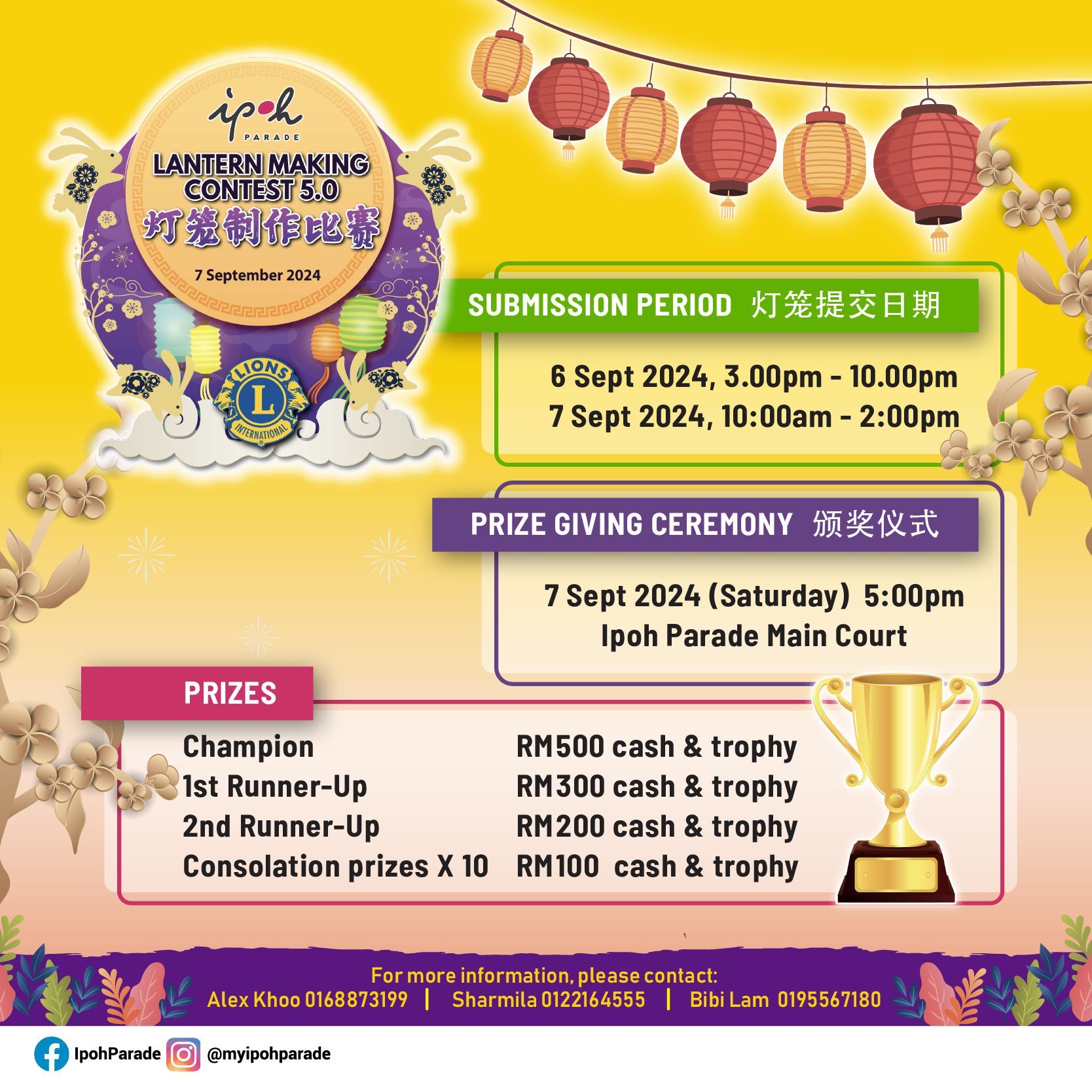 In collaboration with the Perak Lion Clubs, Ipoh Parade will host the 5th Lantern Making Contest, with a special focus on environmental awareness. Participants are encouraged to create their lanterns using eco-friendly materials, showcasing their creativity while promoting sustainability. Lanterns can be submitted at Ipoh Parade starting on 6 September, with the prize presentation on 7 September. This contest is a wonderful opportunity for families and individuals to engage in a meaningful activity that celebrates both tradition and innovation.