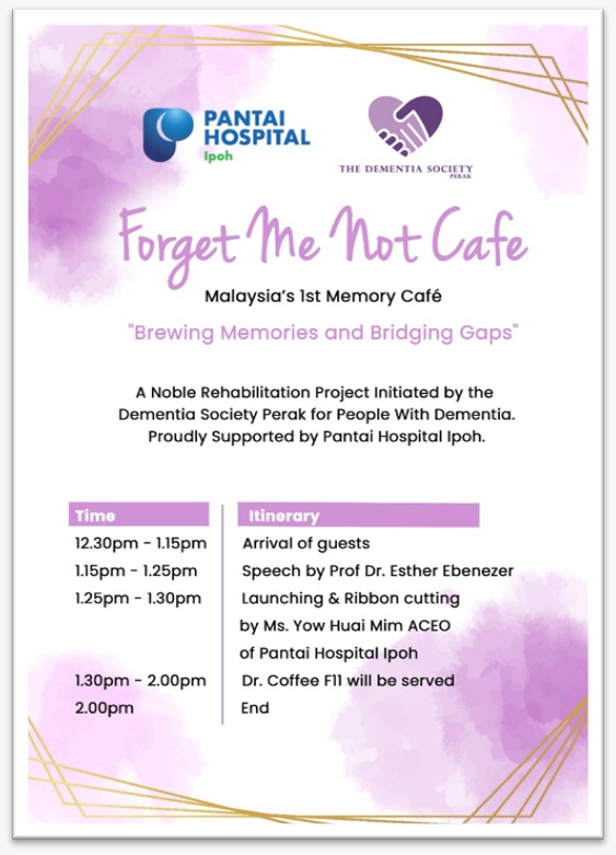 Ipoh is excited to welcome Forget Me Not Café, Malaysia’s first Memory Café, which will open its doors with a special launch event on 19 September 2024 at the Medical Mall, Pantai Hospital Ipoh. The café offers a unique environment where people with early-stage dementia can engage in meaningful activities and find employment in a supportive setting.