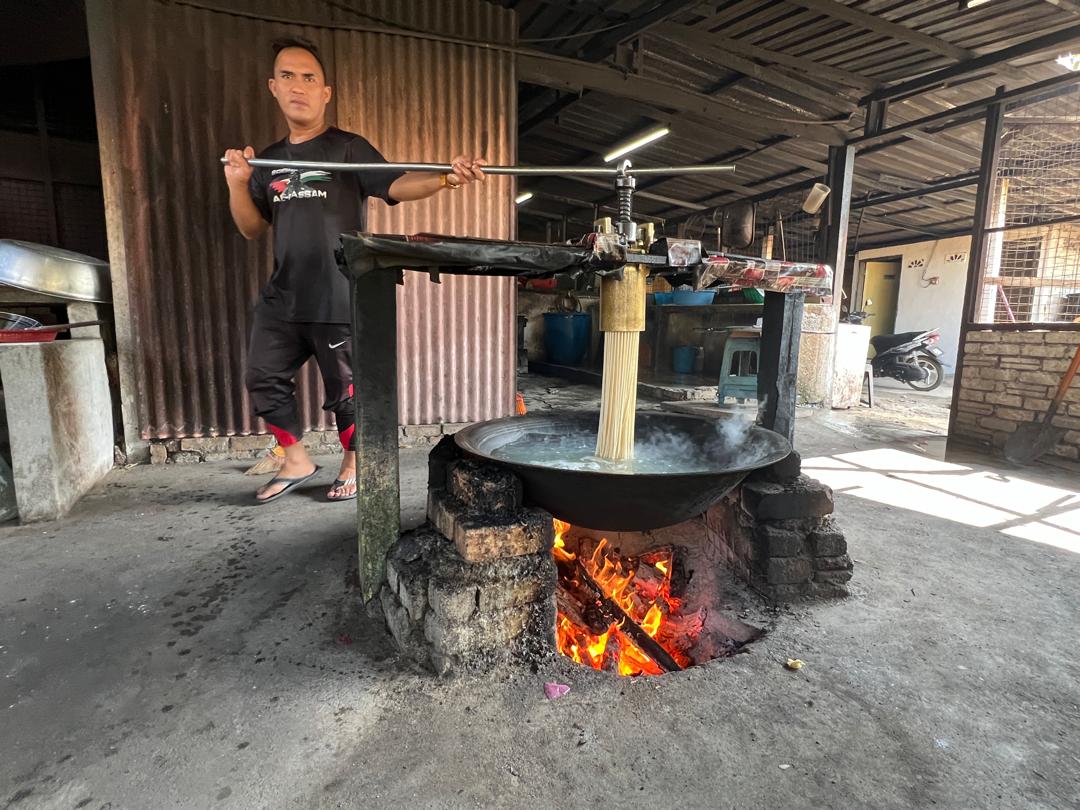 The laksa dough is processed using a ‘kebuk’ (mould) made of brass. The manually mixed dough is placed into the mould and turned 16 times. The laksa then drops into boiling water heated over a wood fire.