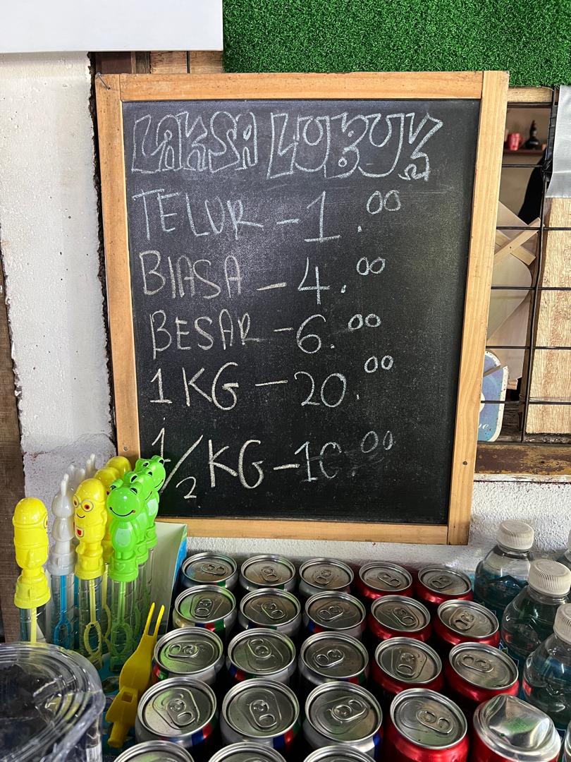 The price of laksa starts at RM4.00 for a small bowl and RM6.00 for a large bowl, with an additional RM1.00 for a boiled egg.