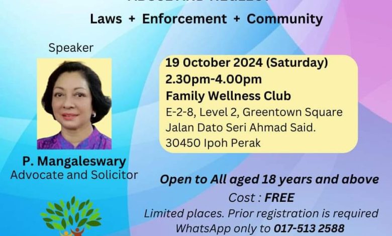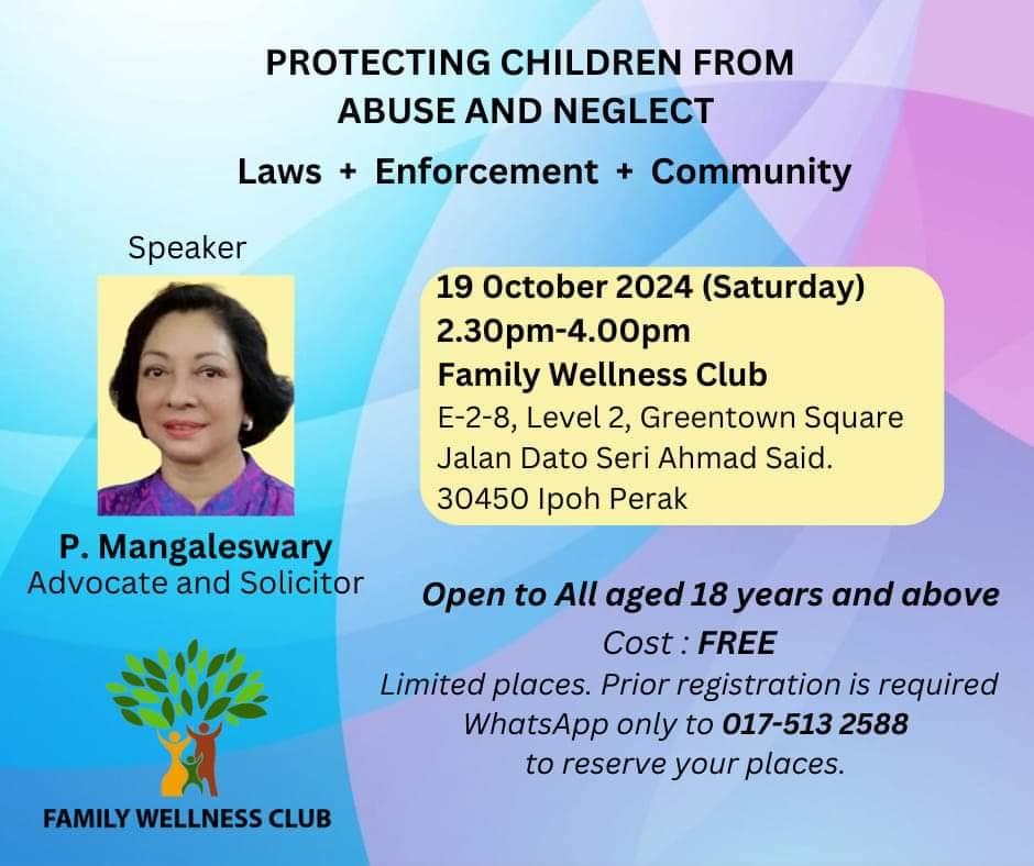 Family Wellness Club presents speaker P. Mangaleswary, advocate and solicitor, who will speak on the topic of Protecting Children from Abuse and Neglect.