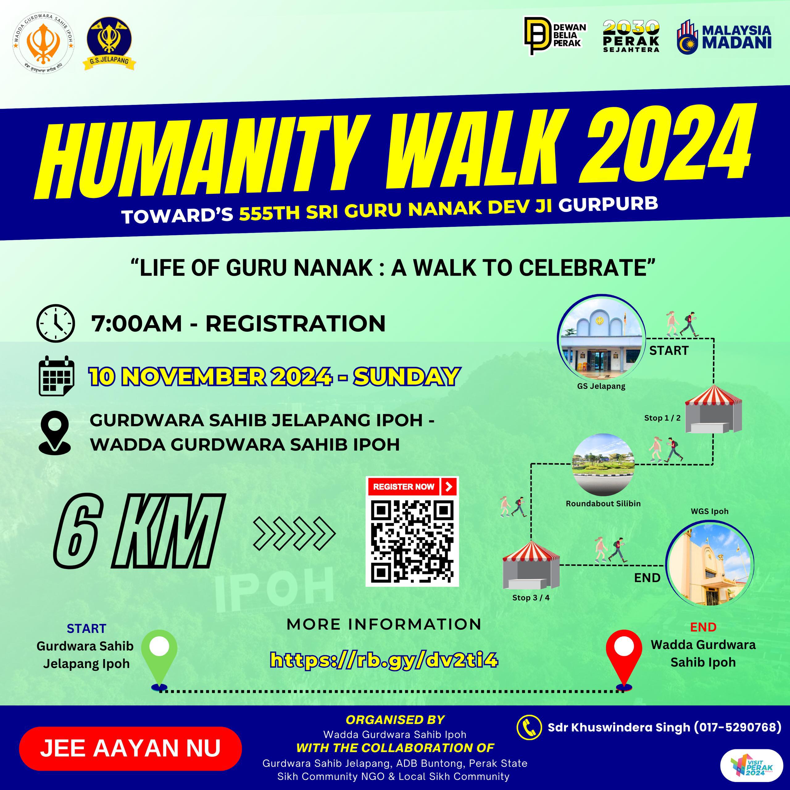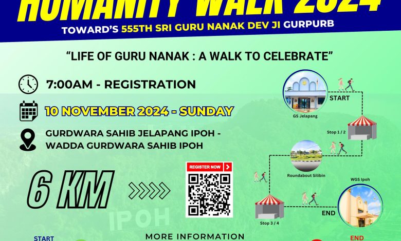 The Humanity Walk 2024 at the Perak State level, in commemoration of the 555th Sri Guru Nanak Dev Ji Gurpurb, will be held on 10 November (Sunday). Beginning at 7 am, the walk will start from the Gurdwara Sahib Jelapang, Ipoh and finish at the Wadda Gurdwara Sahib Ipoh, Perak.