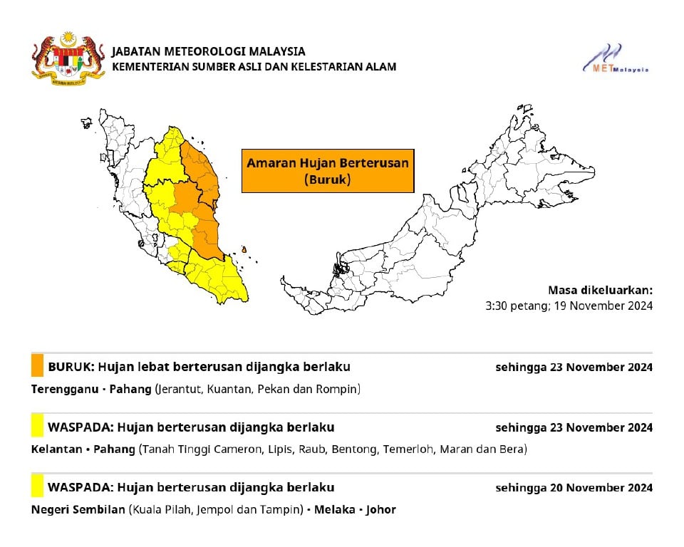 “MET Malaysia is continuously monitoring the weather conditions and will update the Continuous Rainfall Warning if the weather situation is expected to worsen.