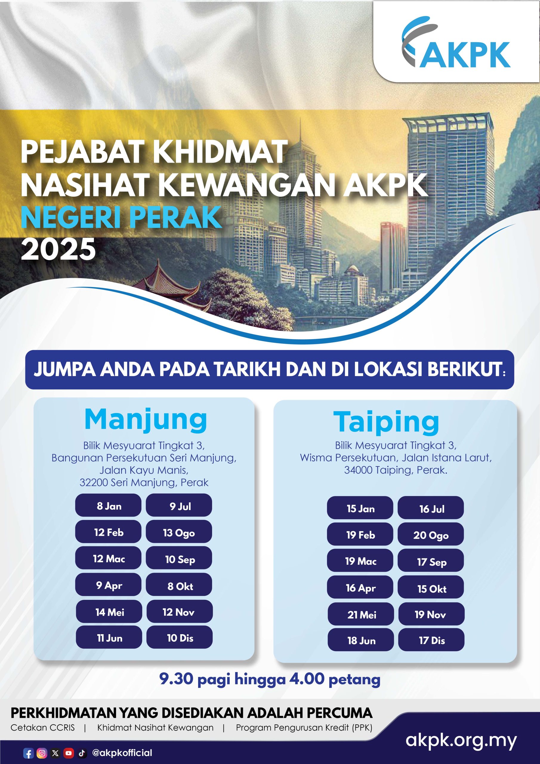 The following are Agensi Kaunseling dan Pengurusan Kredit (AKPK)’s schedule for the AKPK Perak advisory offices at Taiping and Manjung for the year 2025.