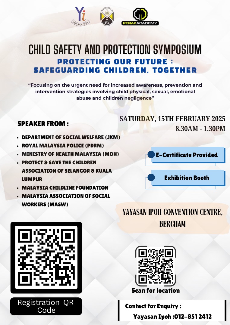 A symposium on the topic of child safety and protection will be held at Yayasan Ipoh (YI)’s Convention Centre at Bercham. This symposium will be held on 15 February, which is a Saturday, from 8.30 am to 1.30 pm.