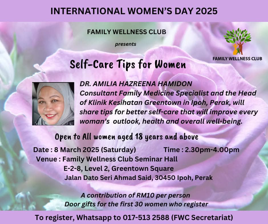 In conjunction with International Women’s Day 2025, Family Wellness Club (FWC) presents “Self-Care Tips for Women”.