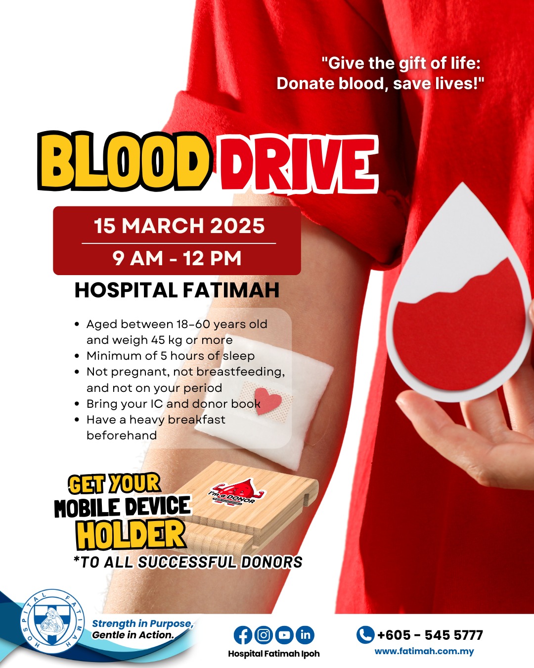 Hospital Fatimah will be holding a Blood Donation Drive on March 15, Saturday, from 9 am to 12 pm, at the Hospital Fatimah Function Room.