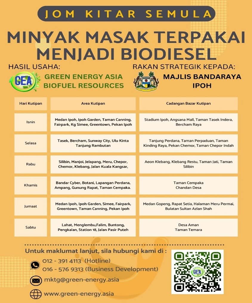 IPOH: Green Energy Asia Biofuel Resources (Green Energy Asia), in collaboration with the Ipoh City Council (MBI), is spearheading an initiative to recycle used cooking oil into biodiesel.