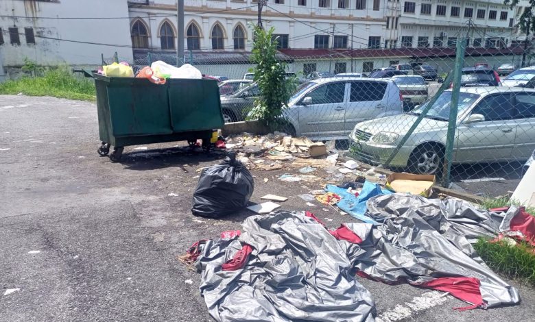 Even with a rubbish bin provided, trash is still scattered around—like cardboard boxes and polystyrene food containers.