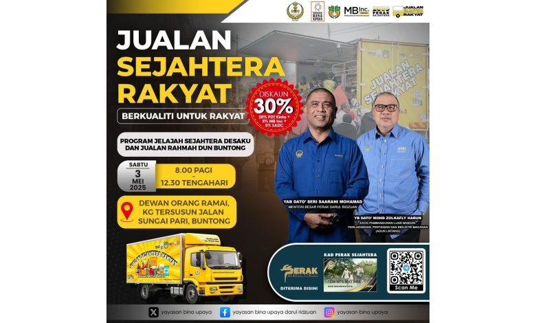 Don’t know where to go this Saturday? Then join the “My Village Prosperity Tour of Perak State and Rahmah Sale for the Buntong State Assembly Constituency” Programme for 2025 (Program Jelajah Sejahtera Desaku Negeri Perak dan Jualan Rahmah bagi DUN Buntong Tahun 2025) on 3 May, from 8 am to 12.30 pm at Dewan Orang Ramai, Kampung Tersusun Jalan Sungai Pari, Buntong.