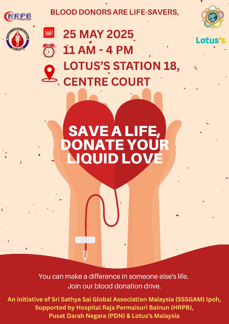 Sri Sathya Sai Global Association Malaysia (SSSGAM) Ipoh proudly are organising their first blood donation drive this Sunday, 25th May 2025, at Lotus’s Station 18, Centre Court from 11 AM to 4 PM.
