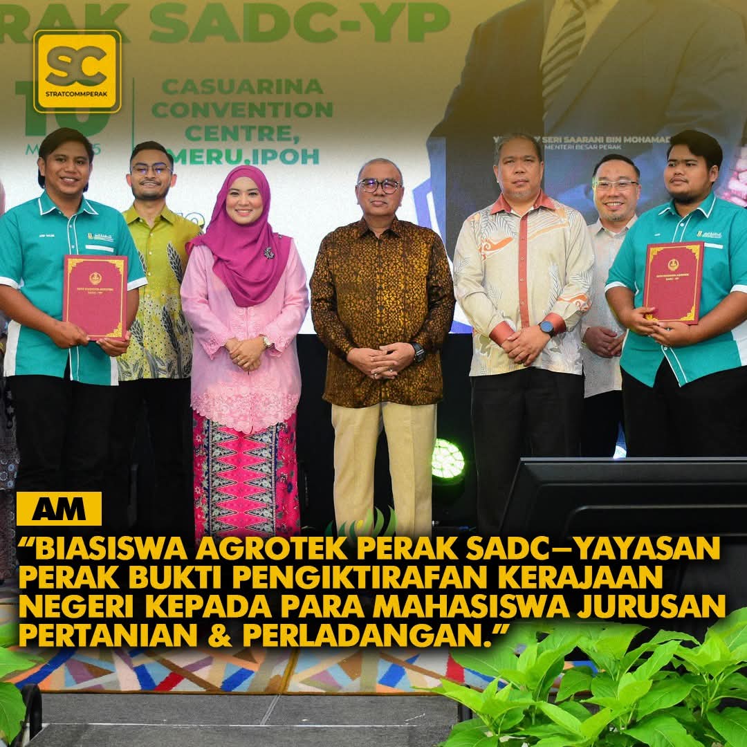 Earlier, the Chairman of the Perak State Committee for Rural Development, Plantations, Agriculture & Food Industry, Datuk Mohd Zolkafly Harun, represented the Perak Chief Minister at the Perak SADC-Yayasan Perak Agrotech Scholarship Award Ceremony held at Hotel Casuarina, Ipoh.
