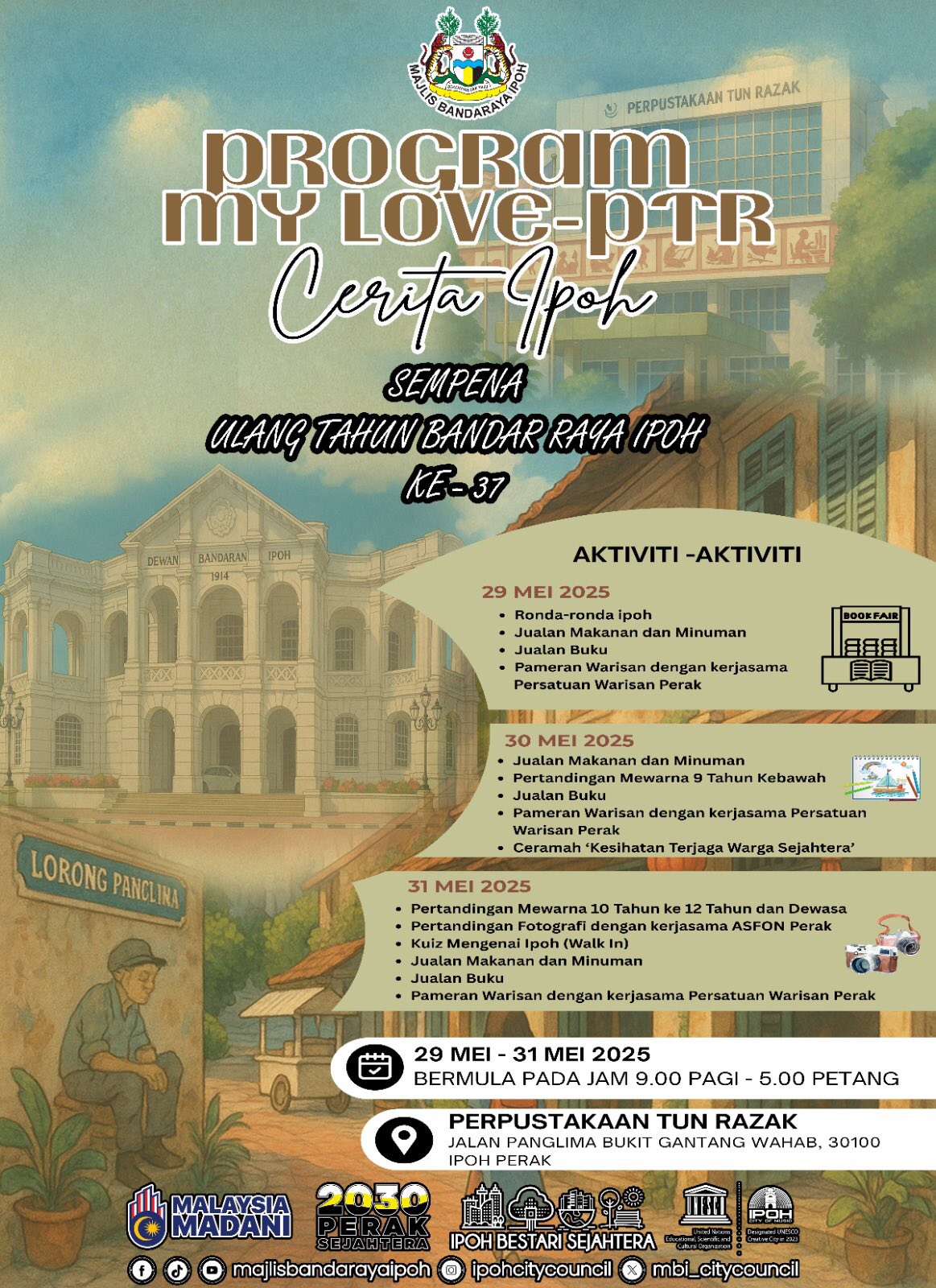 The ‘My Love PTR – Cerita Ipoh’ programme will be held for three days from May 29 to 31 at the Tun Razak Library.
