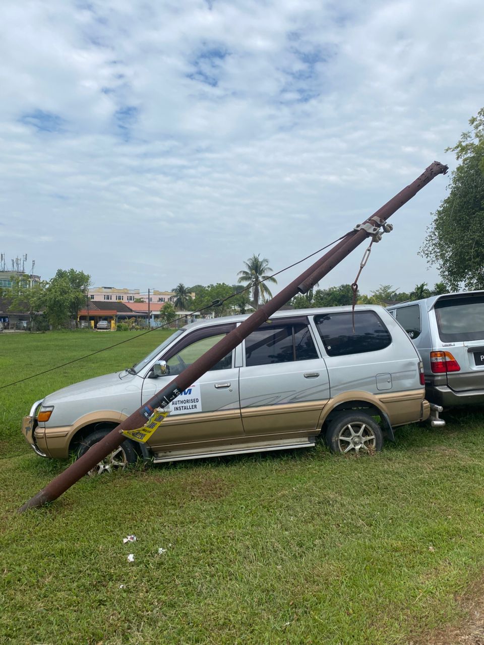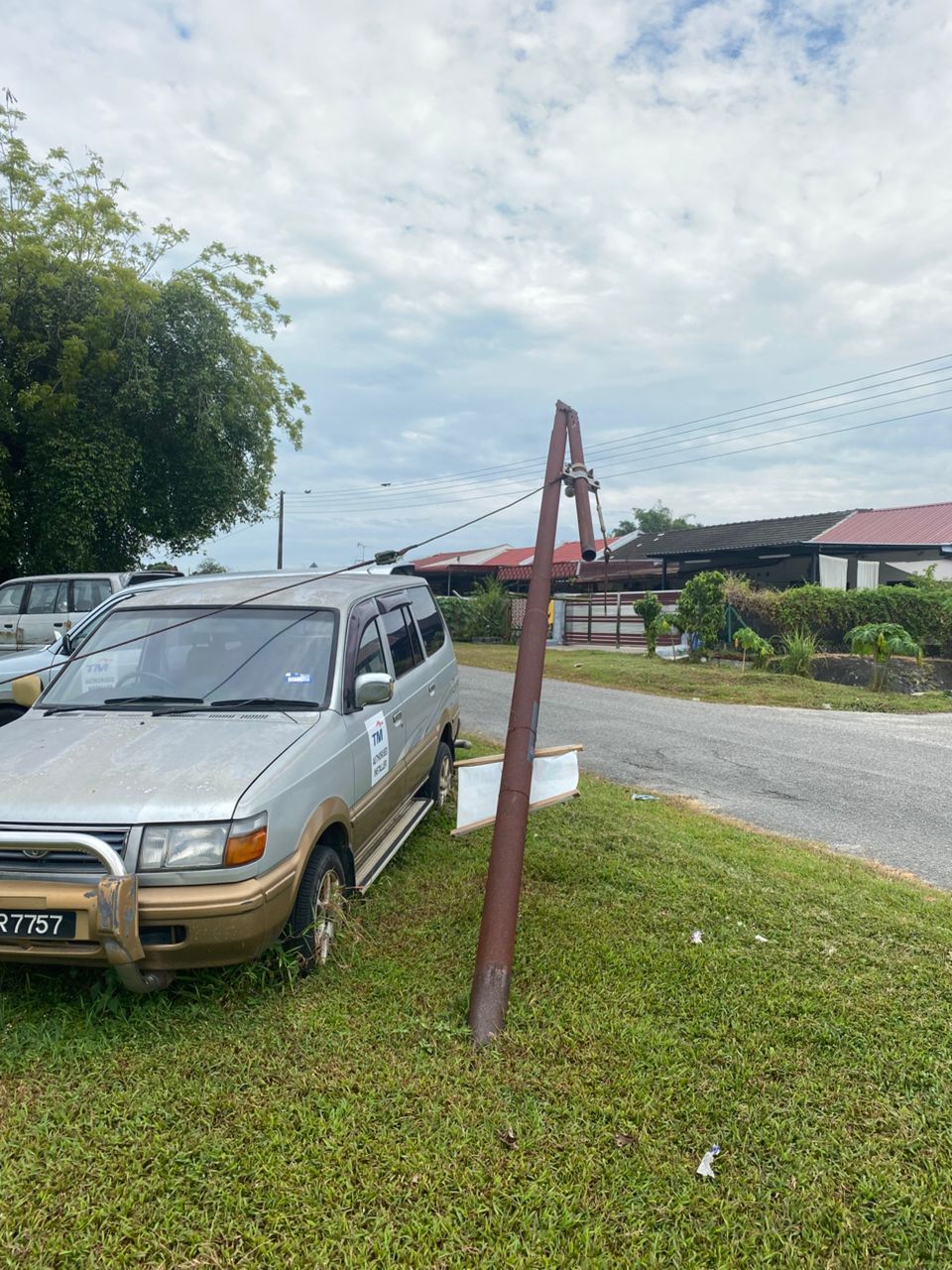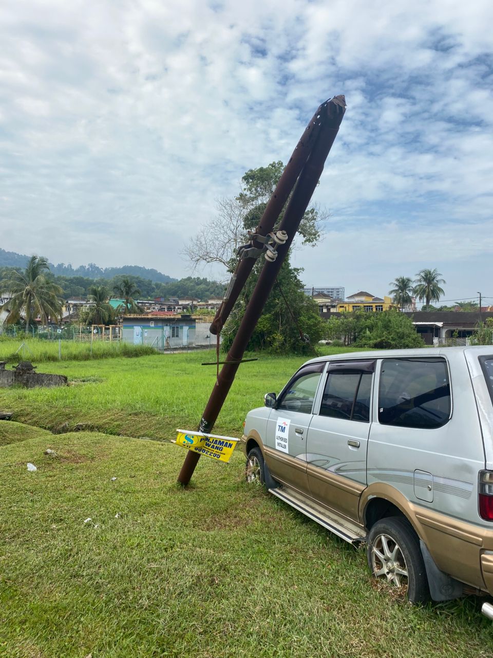 It is understood that the pole has been leaning for quite some time and has not received proper attention from the relevant authorities—whether to be repaired or removed entirely.