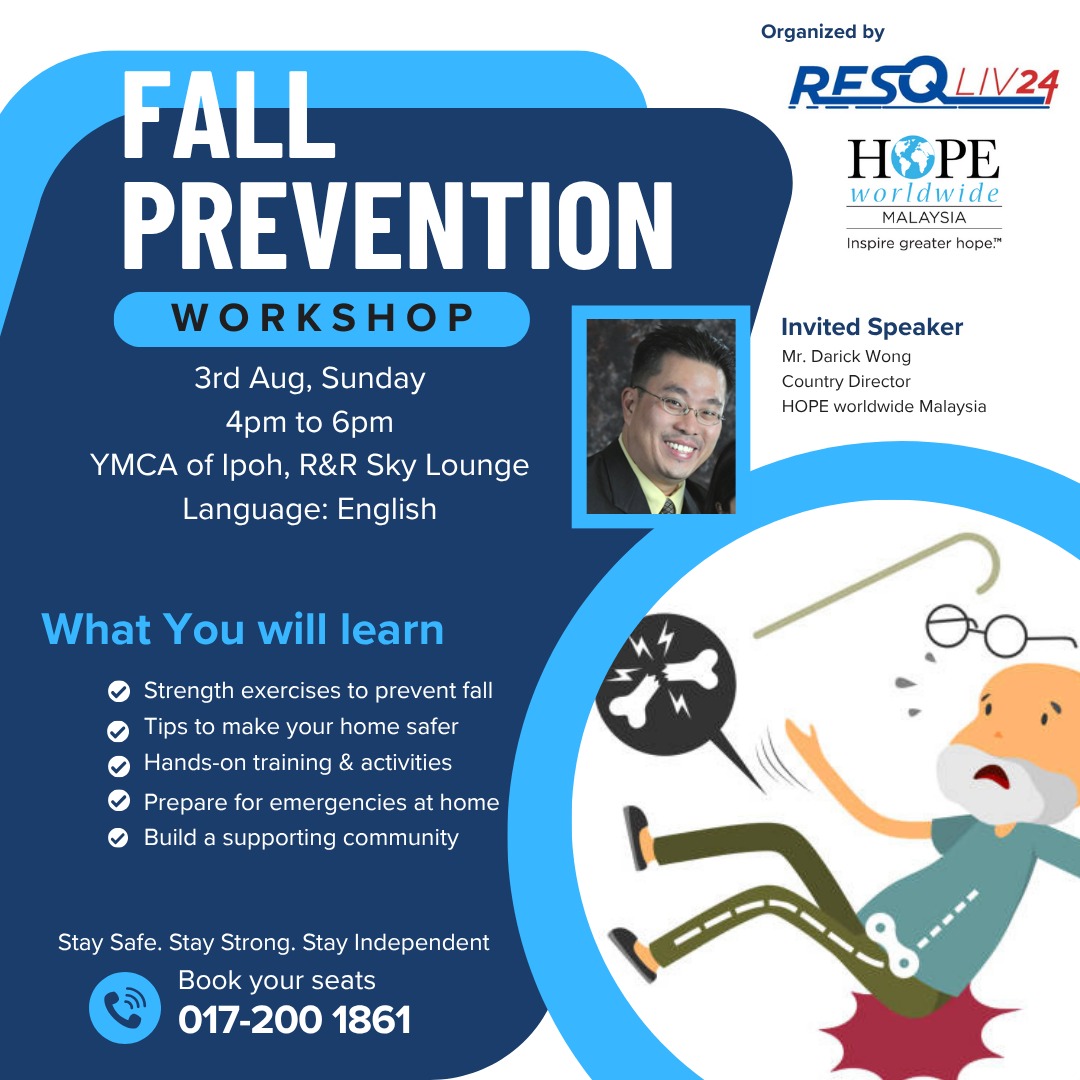 ResQLiv24, in cooperation with HOPE Worldwide Malaysia, are organising a workshop on Fall Prevention on 3 August, from 4 pm to 6 pm, which will be held at the R&R Sky Lounge located at YMCA Ipoh.