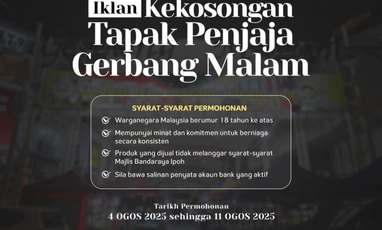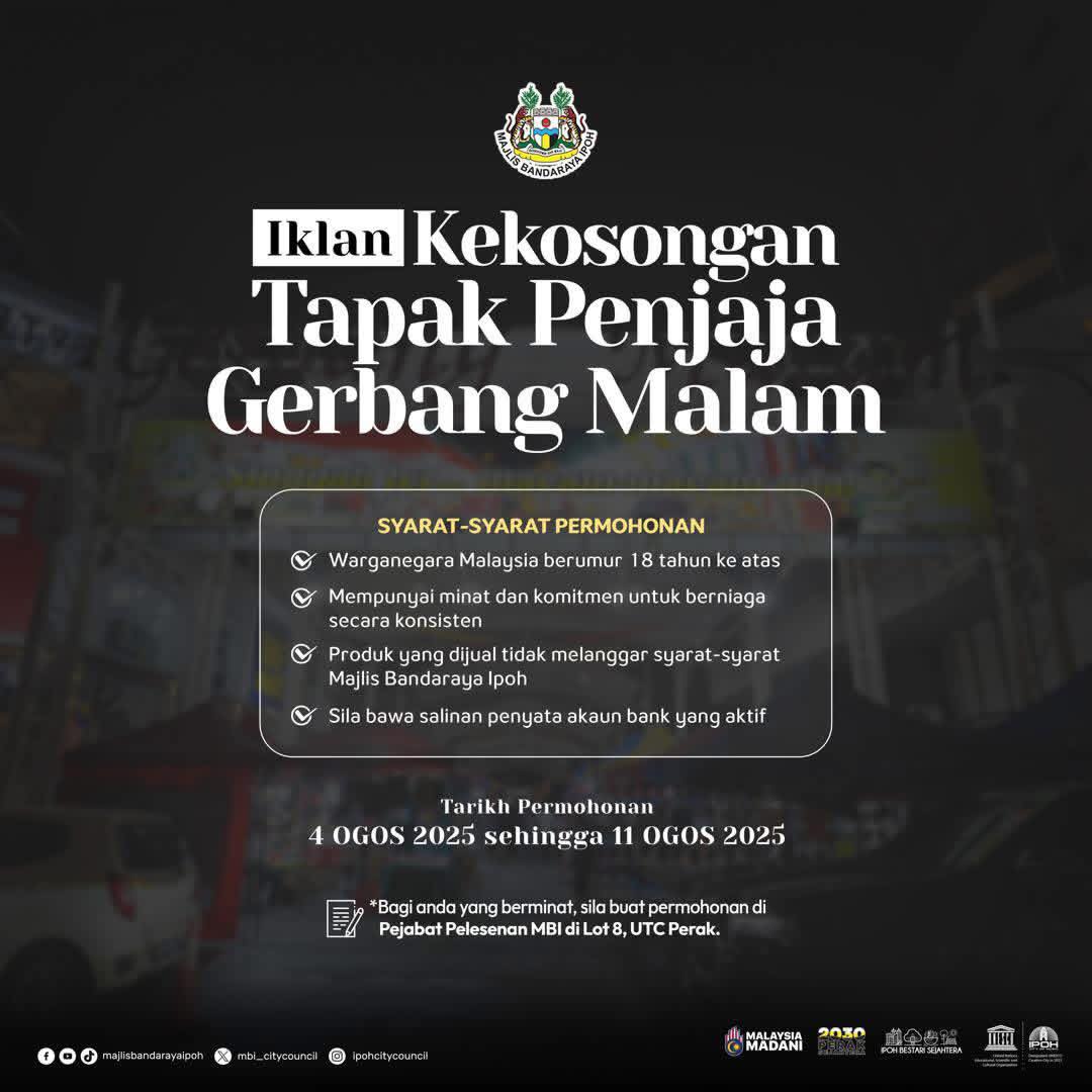 IPOH: The Ipoh City Council (MBI) is inviting members of the public who are interested to apply for vacant hawker lots at Gerbang Malam.