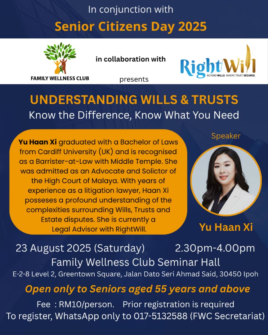 In conjunction with Senior Citizens Day 2025, Family Wellness Club in collaboration with RightWill will be having a special programme for seniors titled “Understanding Wills and Trusts : Know the Difference, Know What You Need”.
