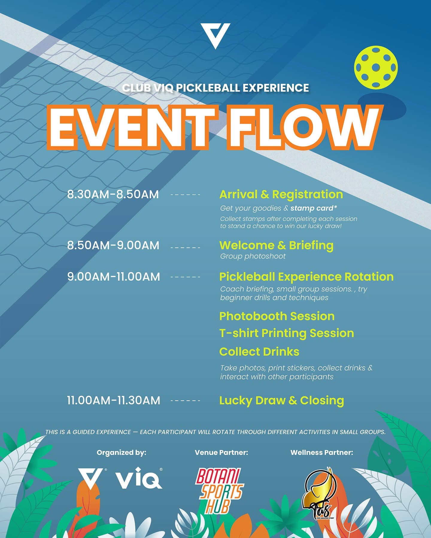 This will be followed by a welcome and briefing at 8:50 AM, before starting the activity rotations from 9:00 AM to 11:00 AM, which include pickleball coaching, the photobooth, T-shirt printing, and drink collection.